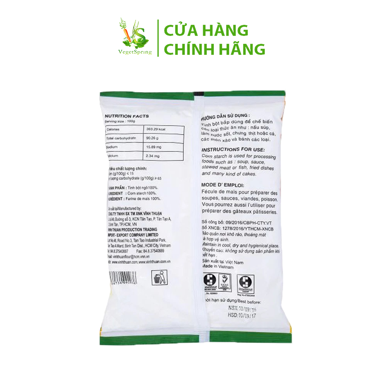 Sản phẩm Bột bắp Vĩnh Thuận đã được đóng gói kín đáo, dày dặn và hợp vệ sinh. Với thiết kế này, bạn có thể dễ dàng bảo quản sản phẩm khi chưa dùng hết một cách lâu dài cũng như phân biệt với các sản phẩm bột khác một cách nhanh chóng.