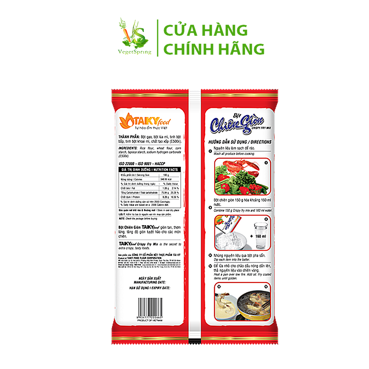 Thành phần Bột Chiên Giòn Tài Ký: Bột gạo, bột mì, tinh bột bắp, tinh bột khoai mì, bột phụ gia thực phẩm, chất nhũ hóa E(450i), chất tạo xốp E(500ii).