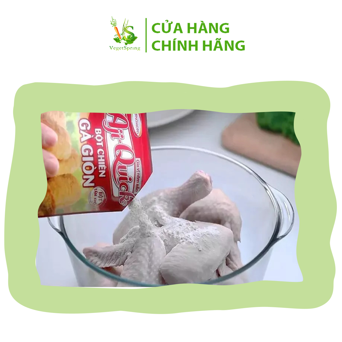- Cho Bột chiên gà giòn Aji Quick vào theo hướng dẫn: 1 muỗng bột cho 200g nguyên liệu; 2.5 muỗng bột cho 500g nguyên liệu.