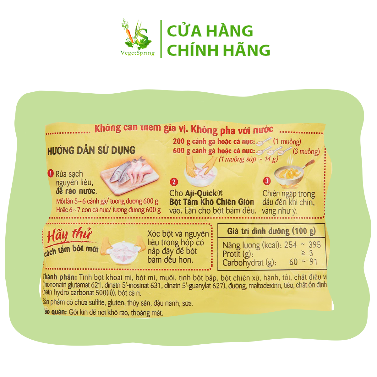 Thành phần: Tinh bột, bột mì, muối, bột bắp, bột chiên xù, hành, tỏi, chất điều vị, bột cà ri...