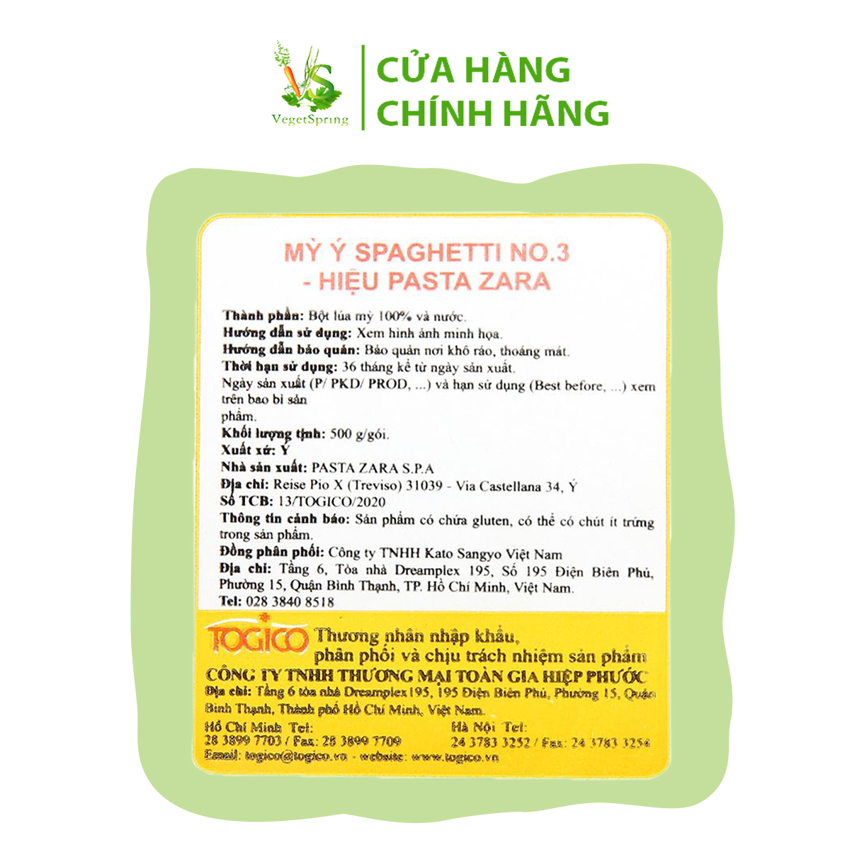 Quy cách: 500g/gói, 20 gói/thùng