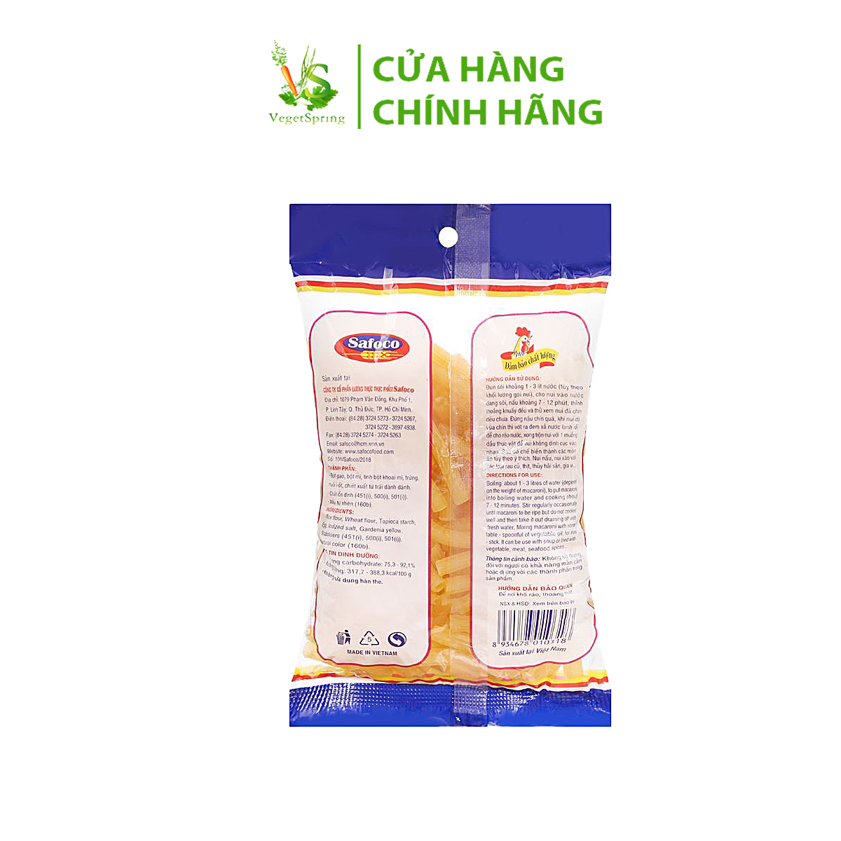 Thành phần Bột gạo 64%, bột mì 17%, tinh bột khoai mì 17%, trứng (1%, đã qua kiểm dịch), muối ăn, chất ổn định (Pentasodium Triphosphate (E451i)), màu thực phẩm tổng hợp (Tartrazine (E102), Sunset Yellow FCF (E110)).
